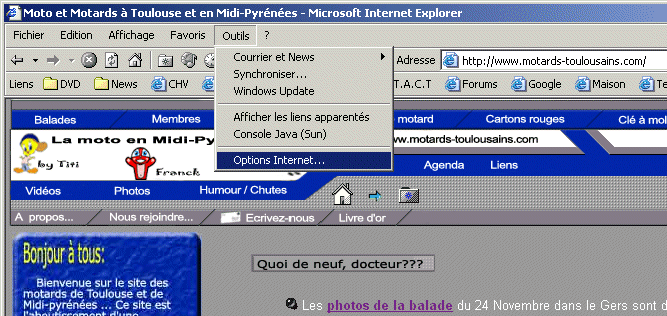 Voici la marche à suivre pour régler le problème de cookie qui peut subsister avec le forum dans certains cas. Ouvrir Internet Explorer, en selectionner "Options Internet..." dans le menu "Outils"