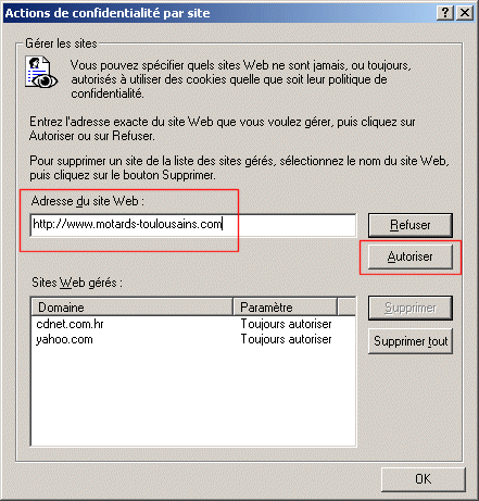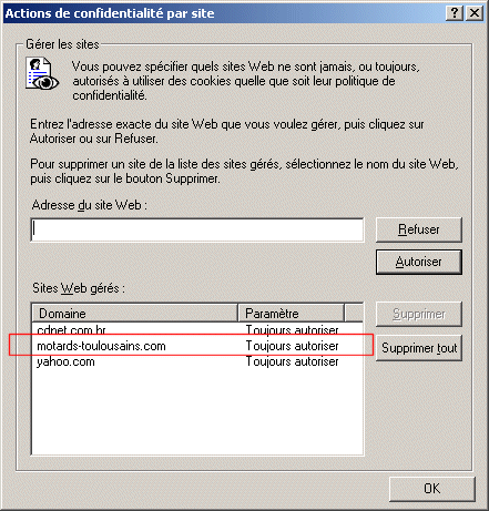Dans la liste juste au dessous du champ de saisie, le domaine "motards-toulousains.com" apparaît comme "Toujours autorisé".